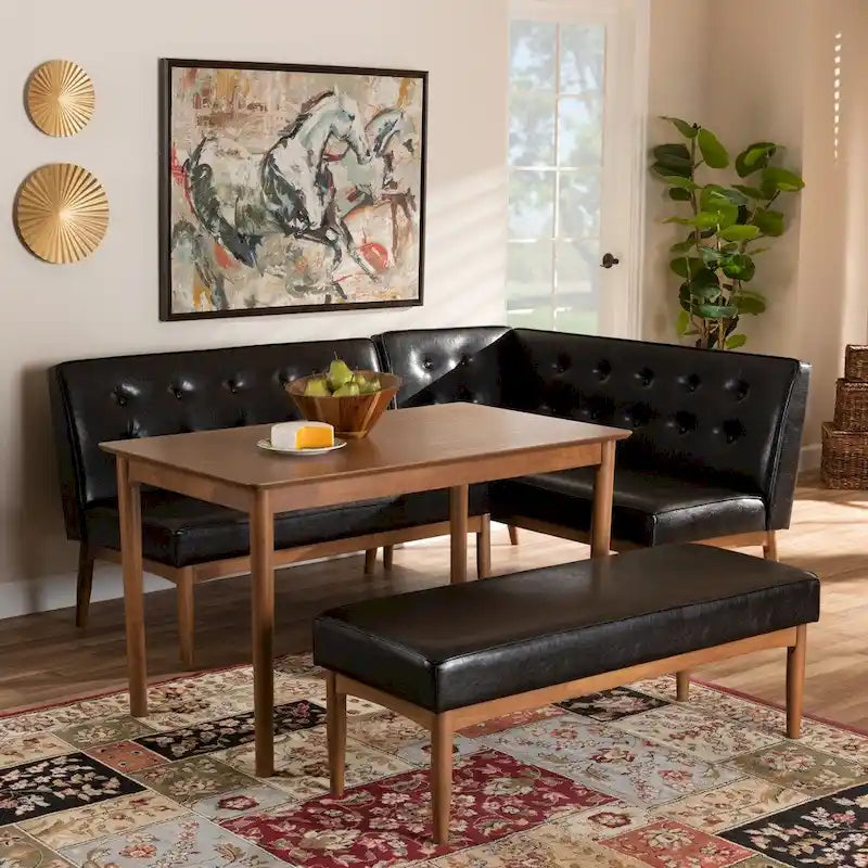 The distinctive and streamlined grace of this dining nook set is sure to set your delicious breakfasts and fabulous game nights off with a bang. Mid-century modern elegance is presented in bold faux leather, button tufting, and tapered legs.