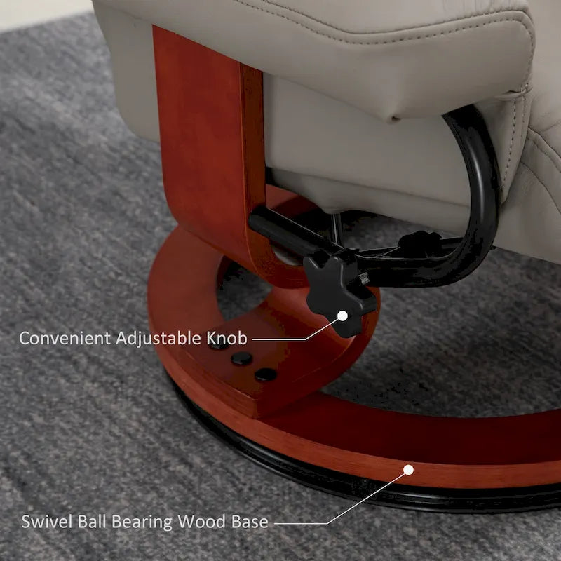 Unwind in style with the HOMCOM Recliner Chair and Ottoman set, featuring a wide-fitting design, high slanted back, and soft, breathable leather upholstery for ultimate comfort. With an adjustable headrest, 360 swivel function, and padded with thick sponge, this chair set is perfect for prolonged sitting or relaxing. The modern design includes a wood base and unique frame, making it a statement piece in any room.