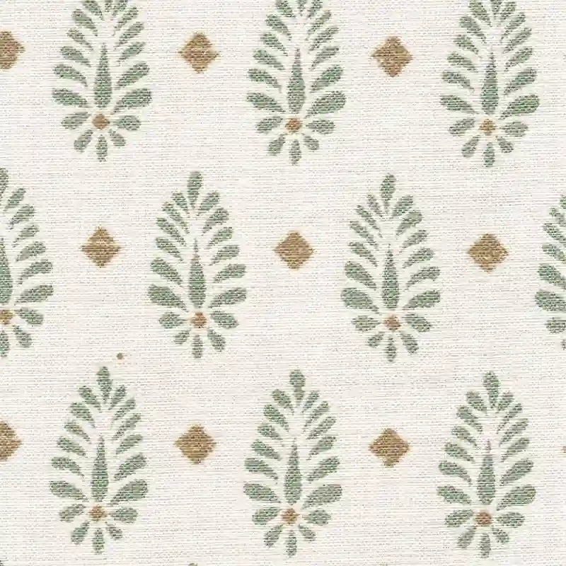 - sage Paisley Medallion print fabric in a honey oak finish