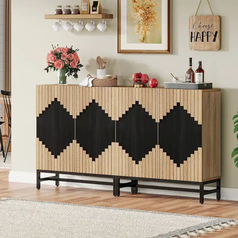 This classic buffet sideboard seamlessly blends farmhouse charm and modern design for an unmatched aesthetic appeal, emphasized by a two-tone door with a geometric pattern. With four shelves, it offers ample storage, perfect for a range of items, enhancing space efficiency. This versatile piece functions excellently as a sideboard, storage cabinet, coffee bar, or TV stand, making it a valuable addition to any room.